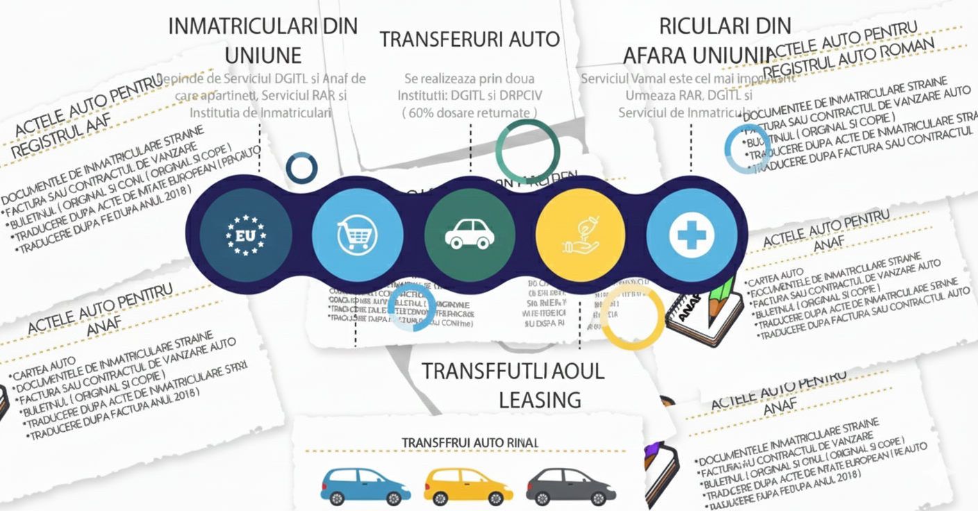 Acte necesare (pentru masini din afara UE): Cartea Auto (primita de la RAR), documente de inmatriculare straine, factura/contract, buletinul, traduceri dupa documentele straine si factura/contract.